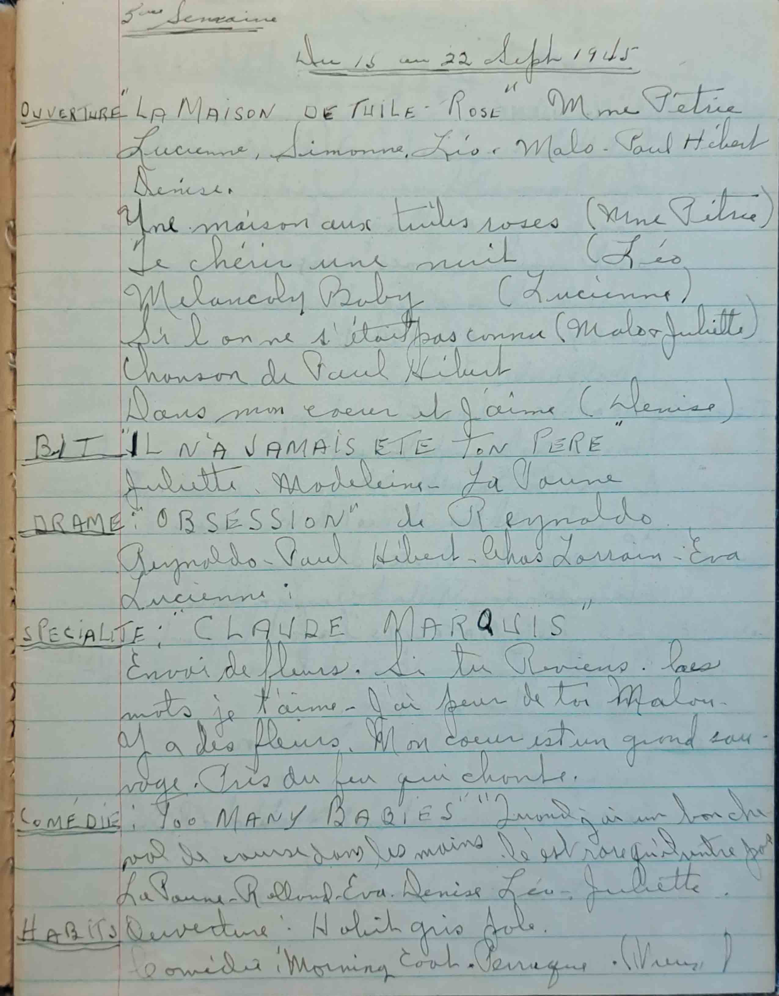 - Cahier manuscrit des programmations du Théâtre National, saison 1945-1946