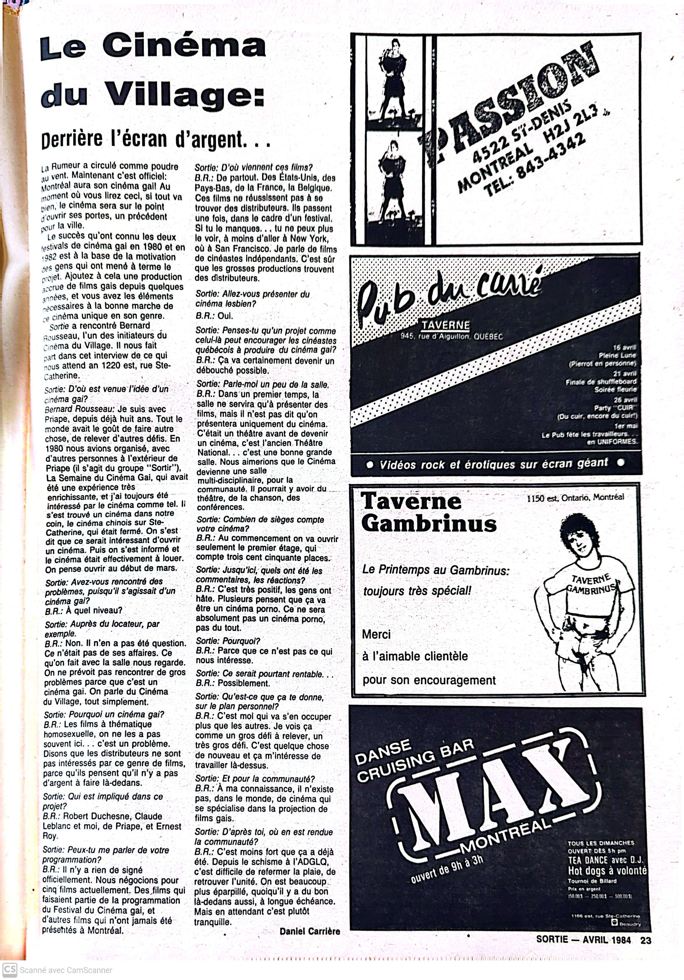 Entrevue avec Bernard Rousseau du Cinéma du Village dans Sortie (avril 1984)