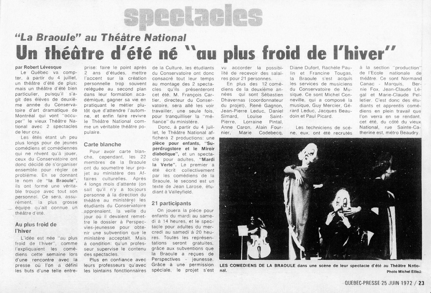 « La troupe La Braoule ravive le Théâtre National le temps d'un été ». Québec-presse (Montréal, Québec), 25 juin 1972, p. 23.