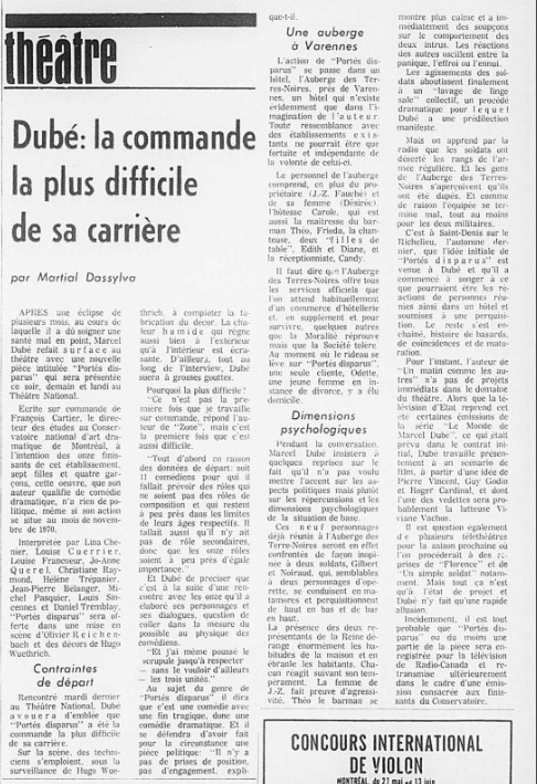 « La commande la plus difficile de Marcel Dubé ». La Presse (Montréal, Québec), 3 juin 1972, p. 4.