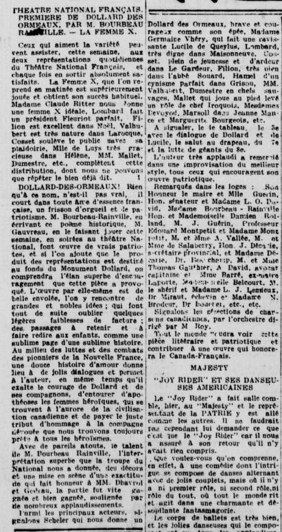« Première de '' Dollard des Ormeaux '' au Théâtre National Français ». La Patrie (Montréal, Québec), 4 avril 1911, p. 7.