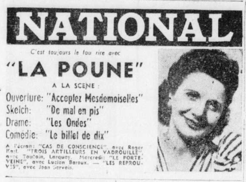 Même si les écritures du cahier ne mentionnent pas directement le Théâtre National, nous pouvons conclure qu’il documente bel et bien les conduites de spectacles qui y ont été présentés. Les dates (1945) ainsi que les noms des artistes qui y figurent nous guident rapidement à ce constat. Il est toutefois possible de confirmer l’information à partir de coupures de presse qui correspondent aux informations lisibles dans le cahier.