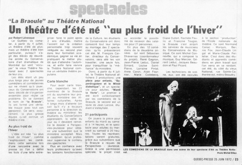 En 1971, les membres de la cohorte entrée à l’automne 1970 échafaudent le projet de poursuivre leurs activités dans le Théâtre National malgré la saison estivale, normalement consacrée aux vacances. Ils obtiennent une subvention Perspectives-jeunesse qui leur assure les fonds pour monter et présenter gratuitement au public deux pièces : Superdrogstore et le miroir maléfique, donnée les après-midi, pour les petits; et Mardi la verte, présentée en soirée, pour les plus grands.
